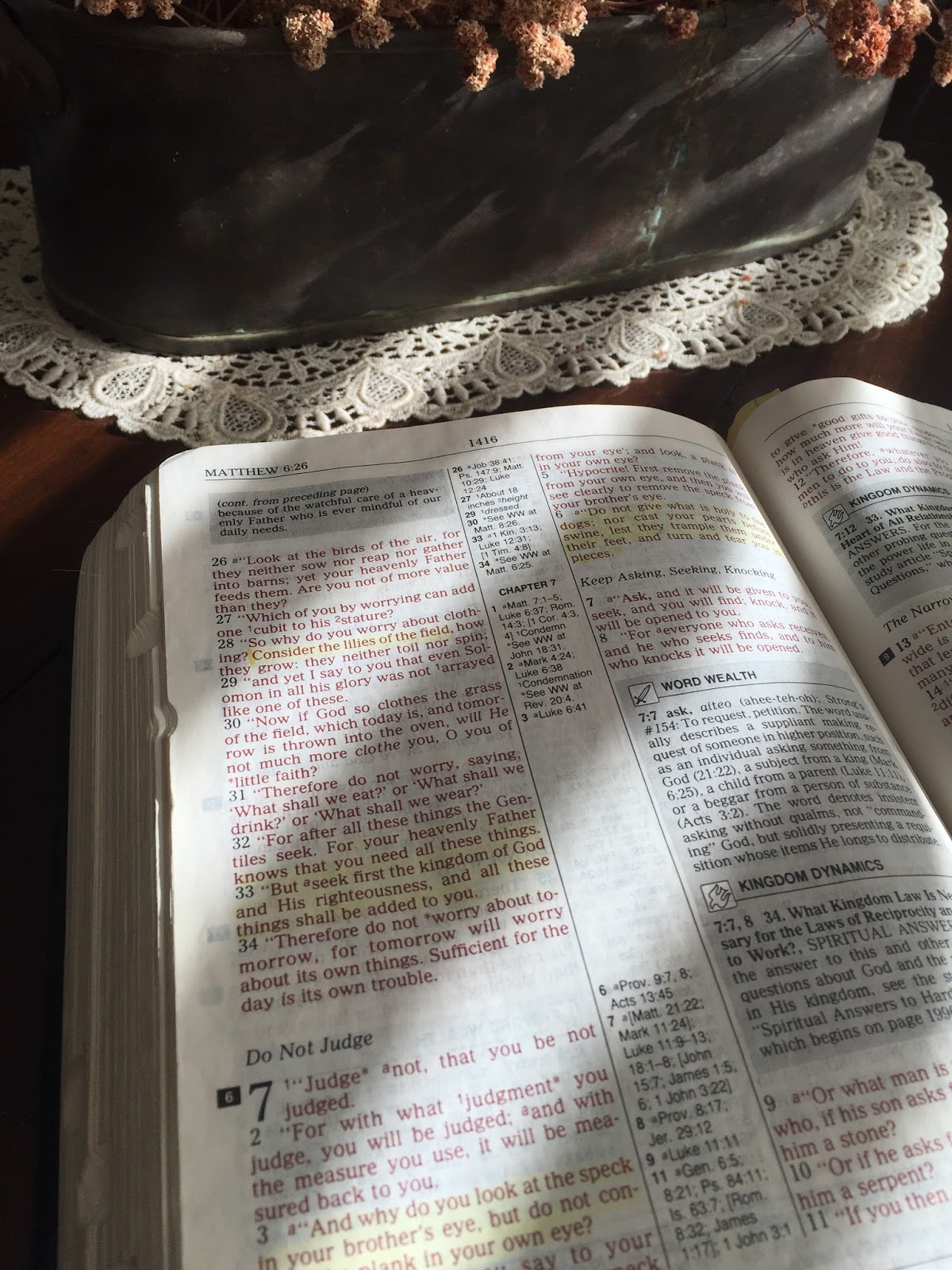 “Ask, and you will find; knock, and it will be opened to you. For everyone who asks receives, and he who seeks finds, and to him who knocks it will be opened. Or what man is there among you who, if his son asks for bread, will give him a stone? Or if he asks for a fish, will give him a serpent? If you then, being evil, know how to give good gifts to your children, how much more will your Father who is in heaven give good things to those who ask Him!” After I had finished sharing this with her, I stayed on that page in Matthew and lingered a while longer.